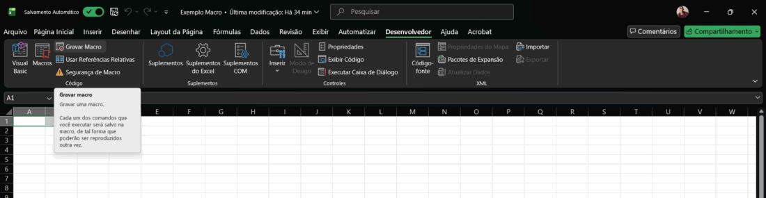 - Para iniciar a gravação vá no guia desenvolvedor e clique em gravar macro