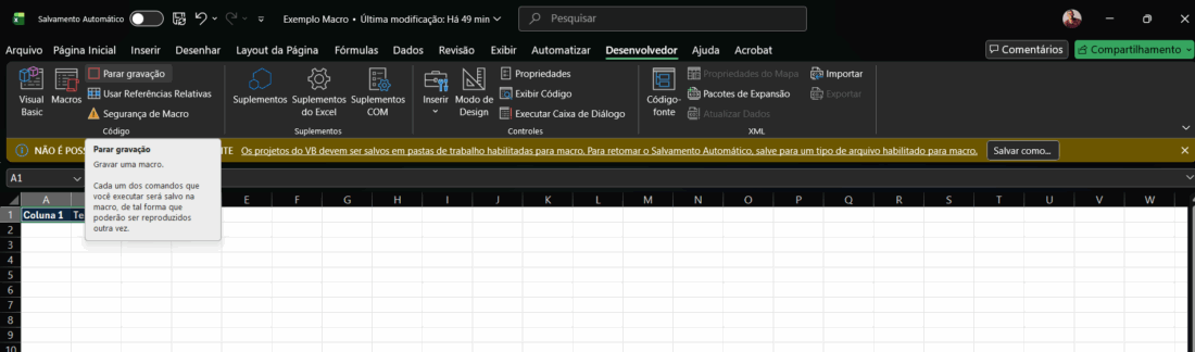 Quando você aperta “parar”, o assistente salva essas anotações. Na próxima vez que você precisar fazer aquela tarefa, basta apertar um botão e o Excel repetirá tudo sozinho.