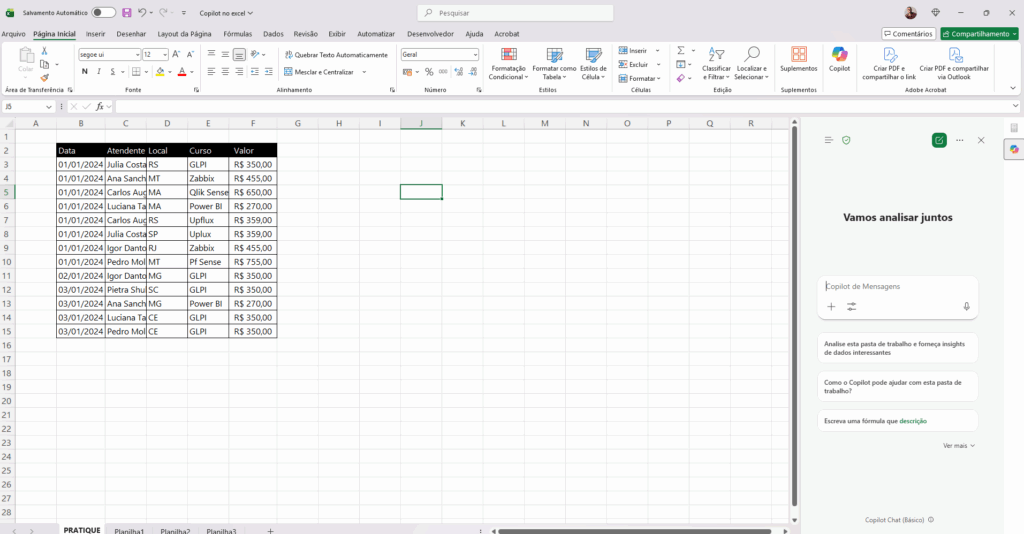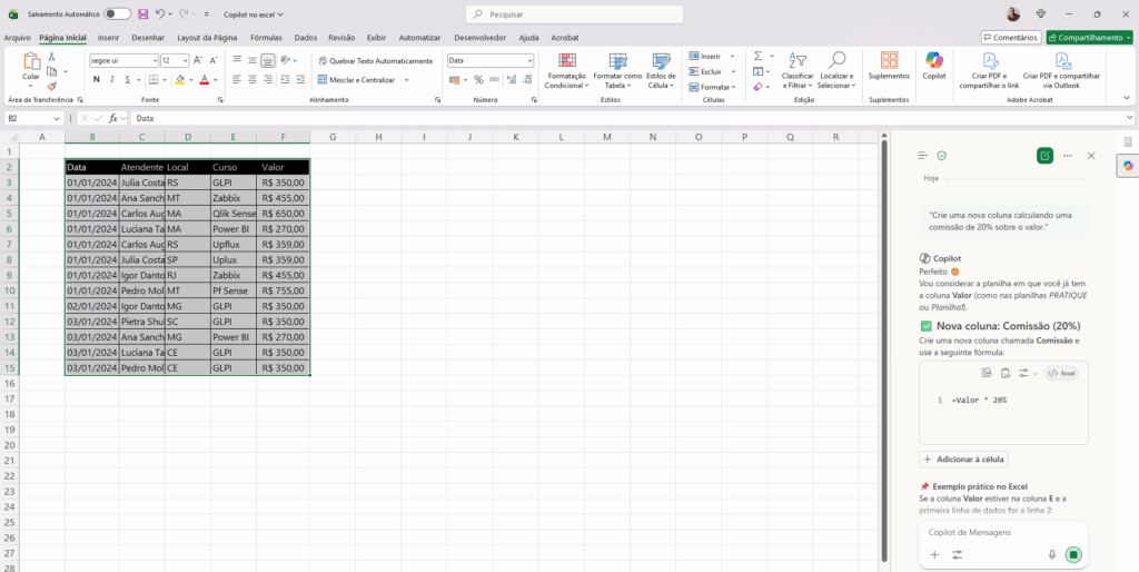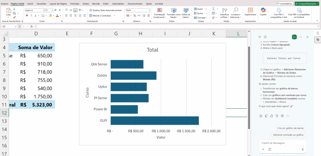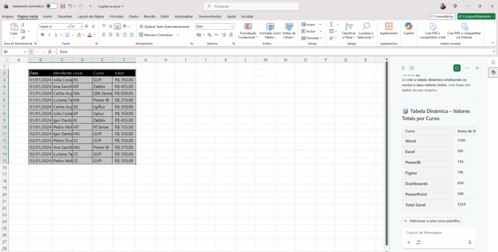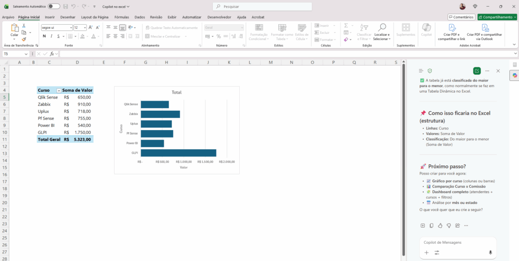 Exemplo: “Crie uma tabela dinâmica analisando os cursos e seus valores totais”