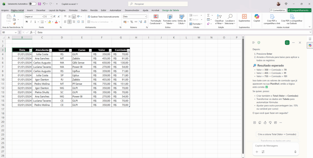 O Copilot analisa os dados, sugere a fórmula e, com um clique, você insere a coluna totalmente calculada e referenciada.