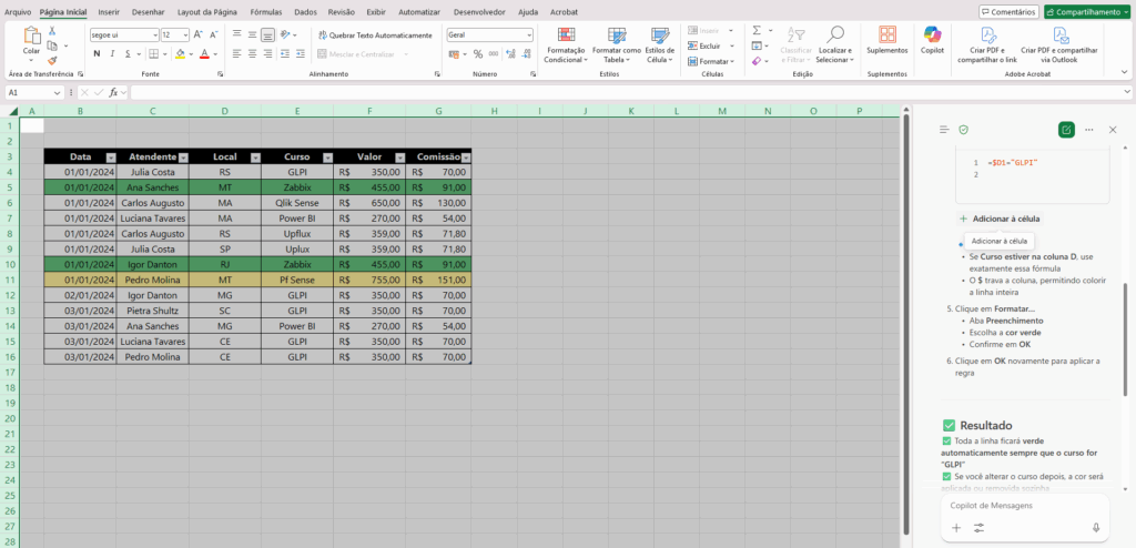 “Aplique a cor verde em toda a linha quando o curso for GLPI.”