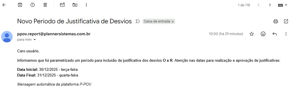 A controladoria escolhe um período de datas para que os gestores enviem suas justificativas, por exemplo, do dia 30/12 ao 31/12. Quando salva, o sistema manda automaticamente um e-mail para todos os gestores envolvidos, avisando sobre o prazo.