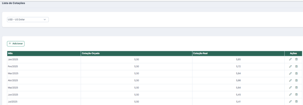 A tela de cotação mostra mês a mês a cotação planejada e a cotação real de cada índice, permitindo que a empresa desenvolva um cenário conservador (índices mais altos) e um cenário otimista (índices mais baixos) para o mesmo contrato.