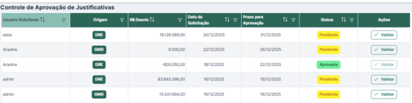 O aprovador recebe uma notificação automática e acessa o “Painel do Aprovador” com uma visão centralizada de todas as justificativas que estão pendentes, o valor do desvio de cada uma, a data de solicitação e o prazo para aprovação. Ele pode validar ou reprovar diretamente.