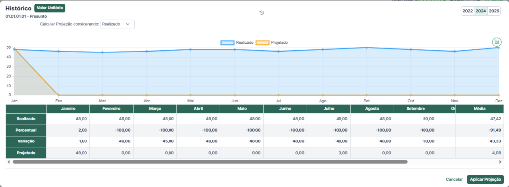 Na imagem acima, mostra como as receitas são organizadas com o Valor Total, o Valor Unitário e a Quantidade de cada SKU, além de um gráfico que mostra como o valor unitário mudou ao longo dos meses. O planejador pode escolher projetar com base no que aconteceu nos anos anteriores e aplicar essa projeção para cada produto, o que ajuda a entender melhor as mudanças no mix, os ajustes de preços e as variações sazonais.